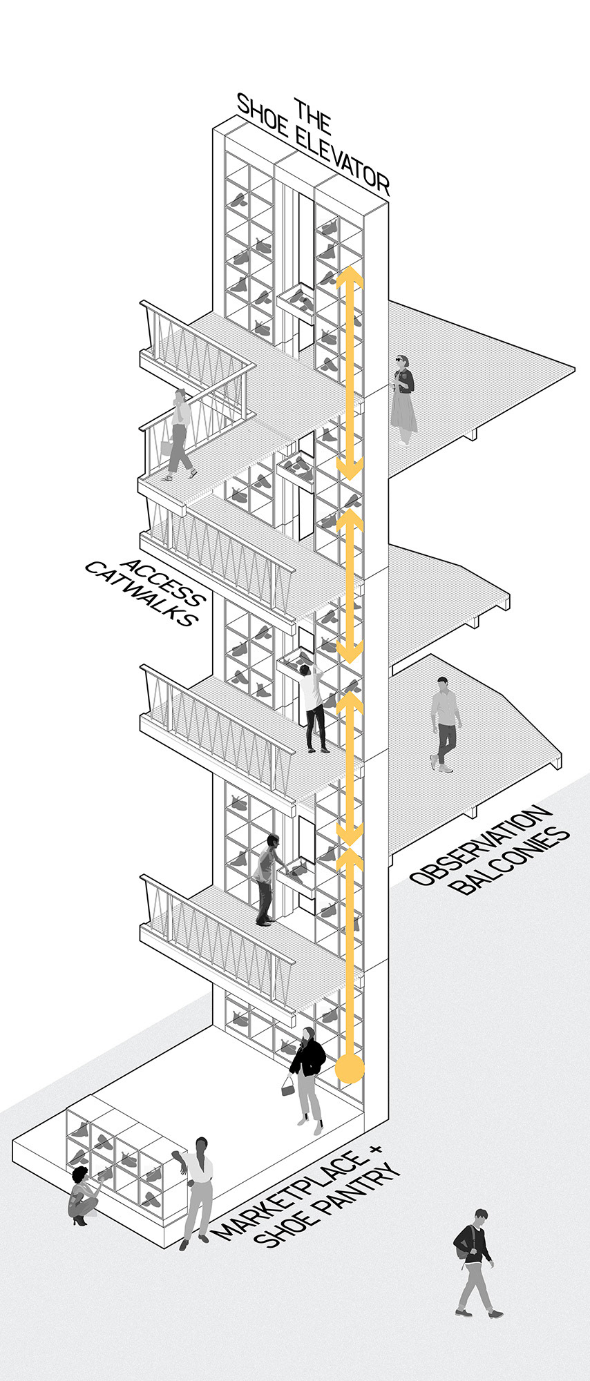 The building is centered around a public atrium and ‘community shelf’ which features ‘shoe elevators’ which can be used by workers to move the shoes between production spaces. This visual spectacle helps to engage and educate the public about each step in the shoemaking process. At the ground floor, the shelf breaks to form the marketplace, spilling out to the edges of the building and the sidewalk. After hours, these street front community shelves allow the building’s unhoused neighbors an opportunity to exchange their worn-out shoes for new ones produced in the market.