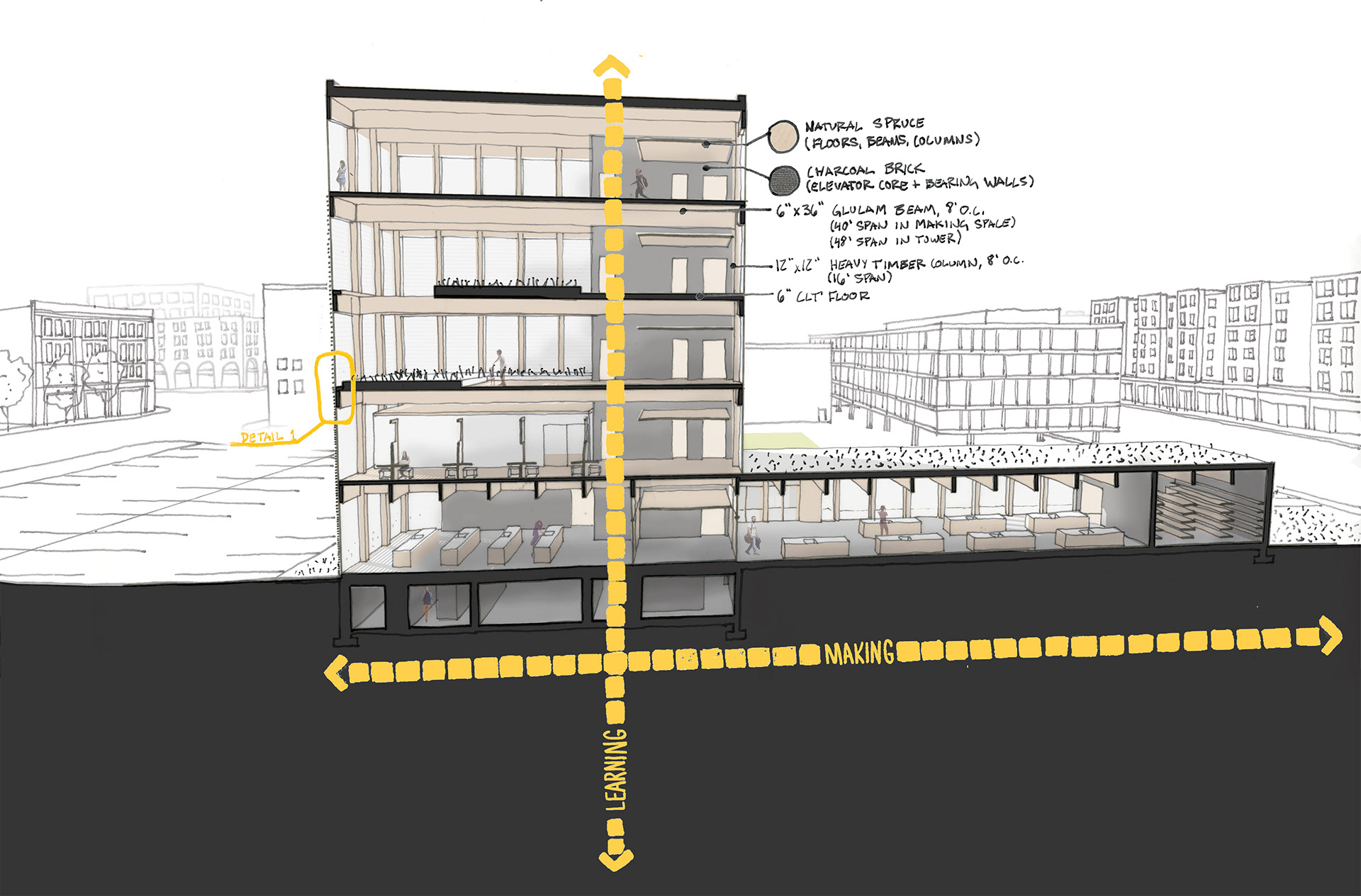 First time users are forced through a string of galleries, starting with a dark space that educates about the issues in the industry. After this, visitors take the elevator all the way to the top floor, where they experience the opposite: a light gallery that showcases the work of the local farmers. From there, users spiral down through the tower, experiencing an indoor and outdoor edible gallery that exposes them to different types of dairy products, before finally landing at the intersection of the learning and making spaces: a classroom for learning how to make their own cheese, instead of relying on the commercial industry.